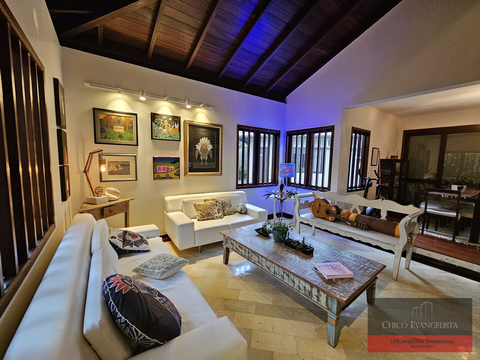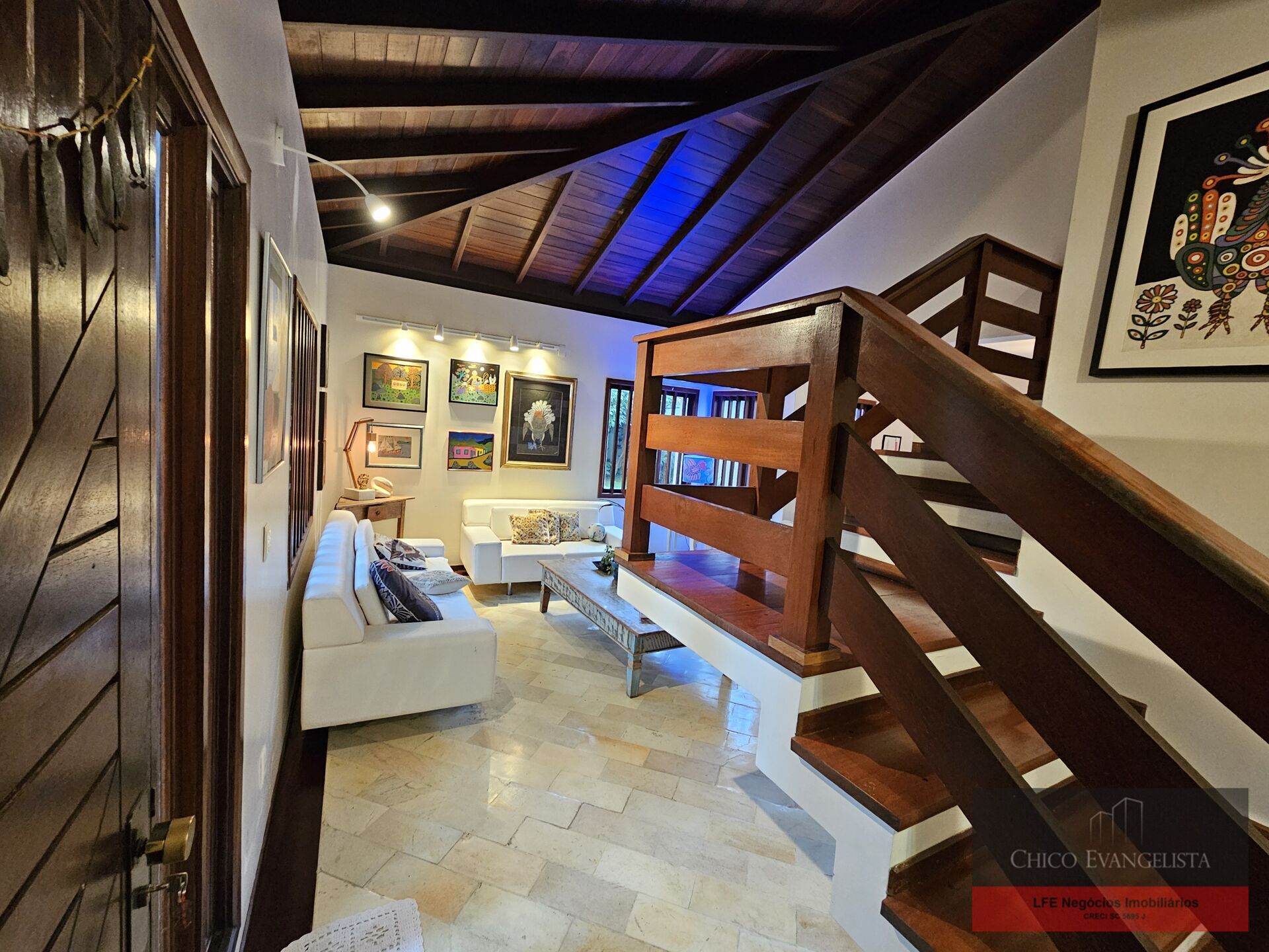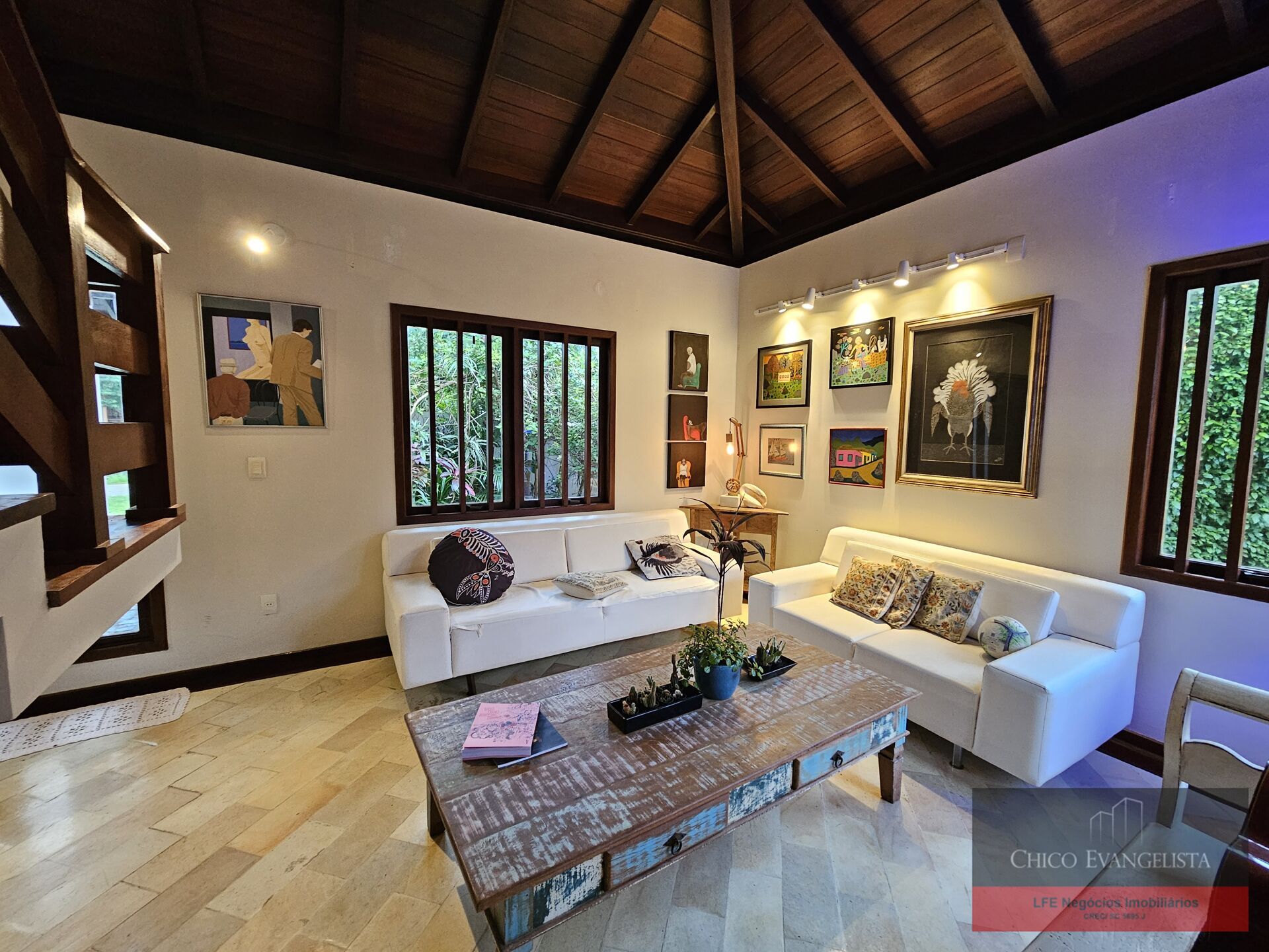 No térreo possui ampla sala de estar com pé direito duplo, forro em madeira nobre, sala de jantar, sala de TV, Lavabo, copa, cozinha montada, área de serviço, dependência completa, varanda integrada ao jardim, garagem para 2 carros.