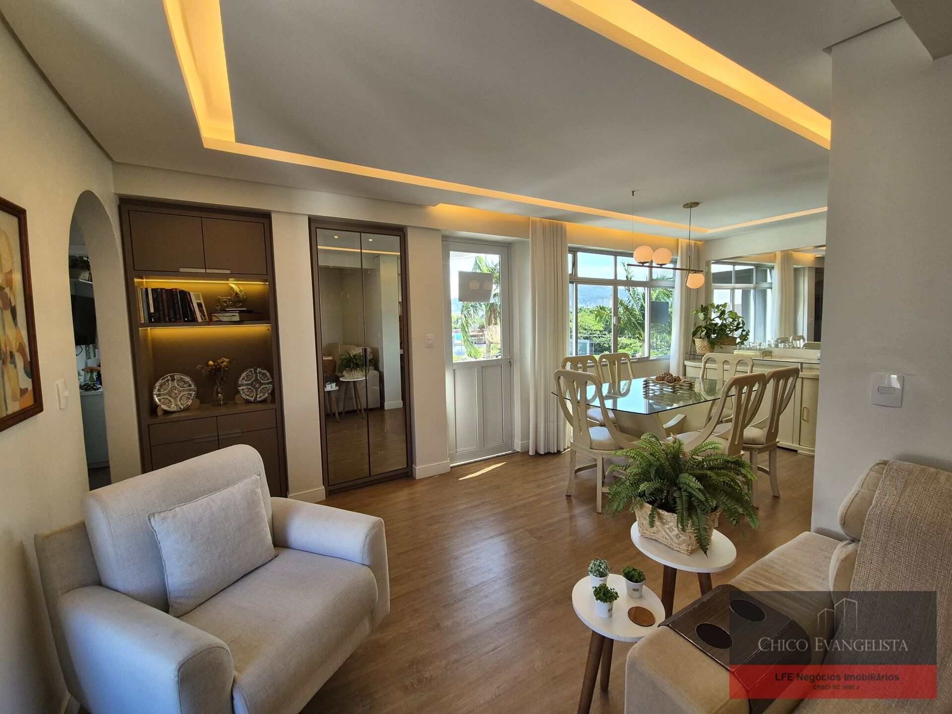 No pavimento inferior estão a sala para 2 ambientes, 2 sacadas, cozinha com móveis planejados, lavabo, pequeno escritório, 2 dormitórios e bwc social.